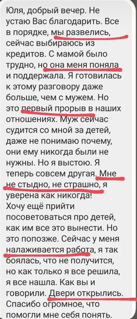 "Юля, добрый вечер. Не устаю Вас благодарить. Всё в порядке, мы развелись, сейчас выбираюсь из кредитов. С мамой было трудно, но она меня поняла и поддержала. Я готовилась к этому разговору даже больше, чем с мужем. Но это первый прорыв в наших отношениях. Муж сейчас судится со мной за детей, даже не понимаю почему, они ему никогда были не нужны. Но я выстою. Я теперь совсем другая. Мне не студно, не страшно, я уверенно как никогда!